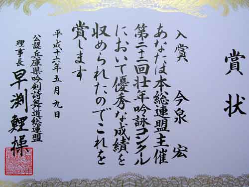 | 04/5/9 | 第22回県壮年吟詠コンクール | 半夜 | 兵庫県民会館 | プロ4番で喉の状態は悪かったが、この大会初めての入賞である。これを契機に更なる飛躍を思う。 |